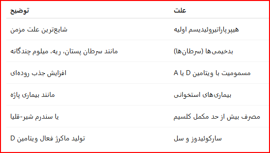 معمولاً ناشی از مصرف زیاد مکمل یا مشکلات پاراتیروئید: